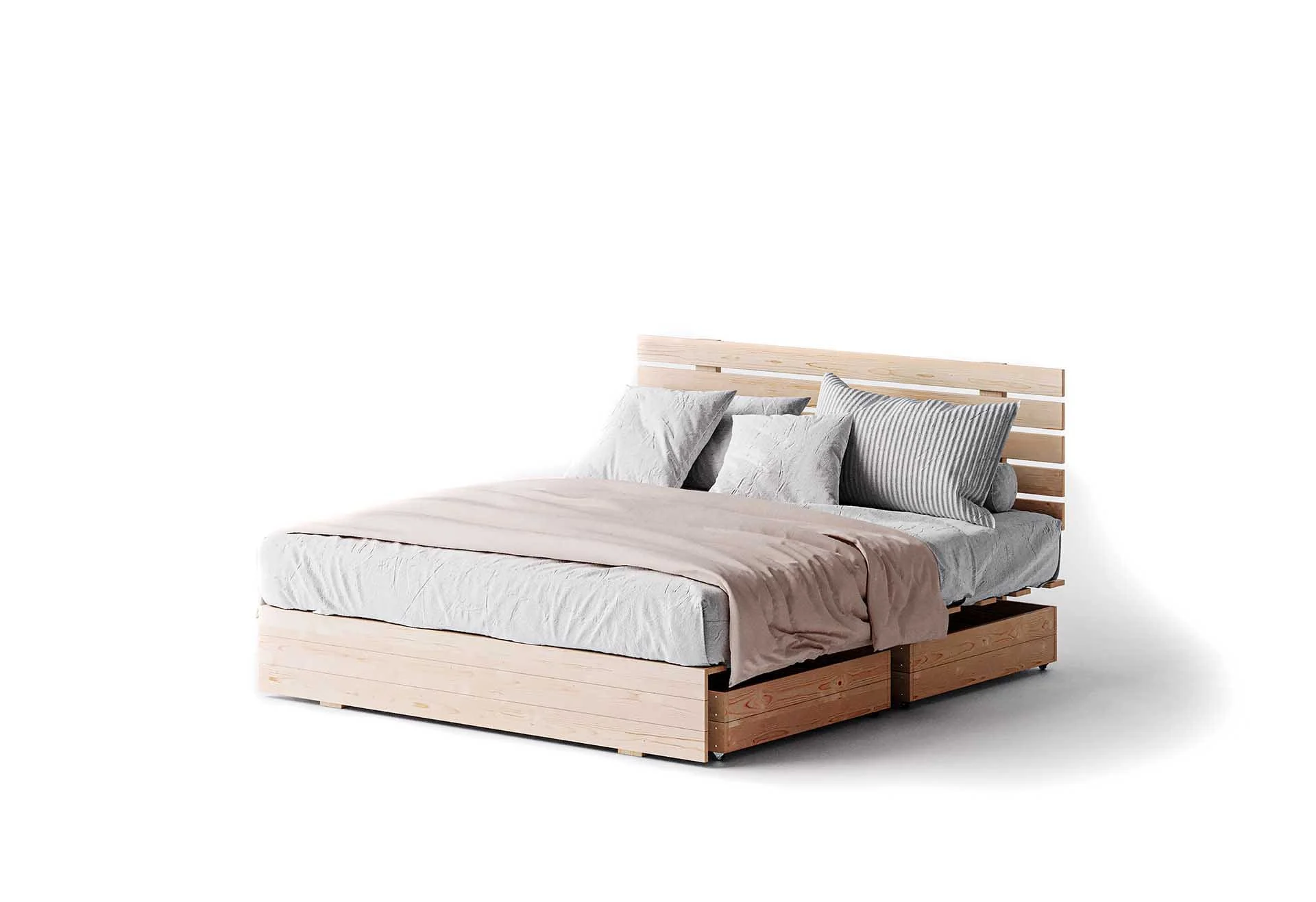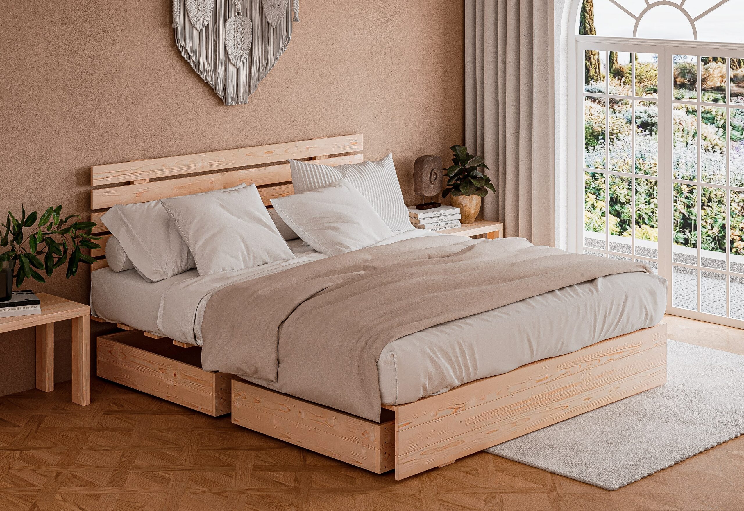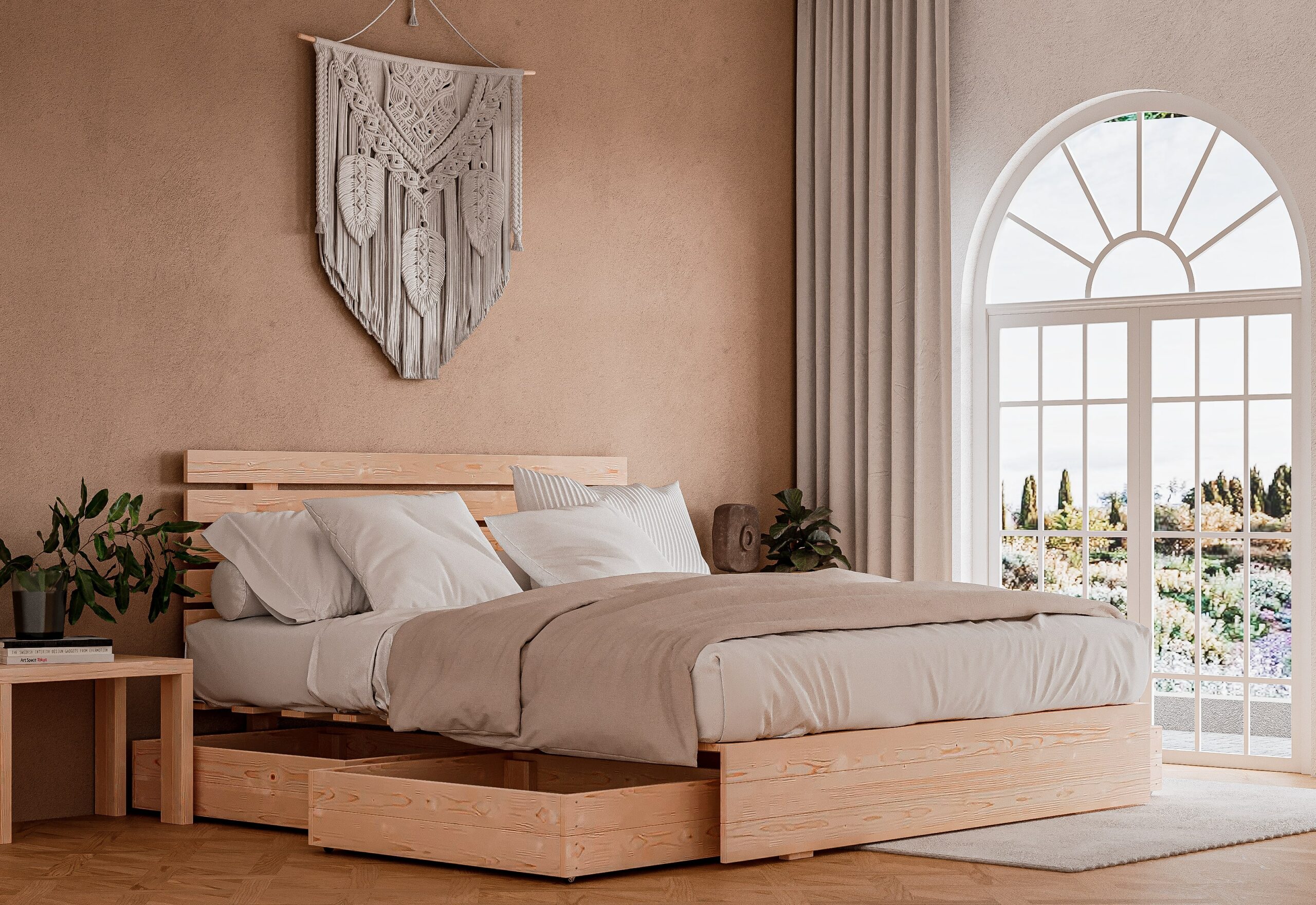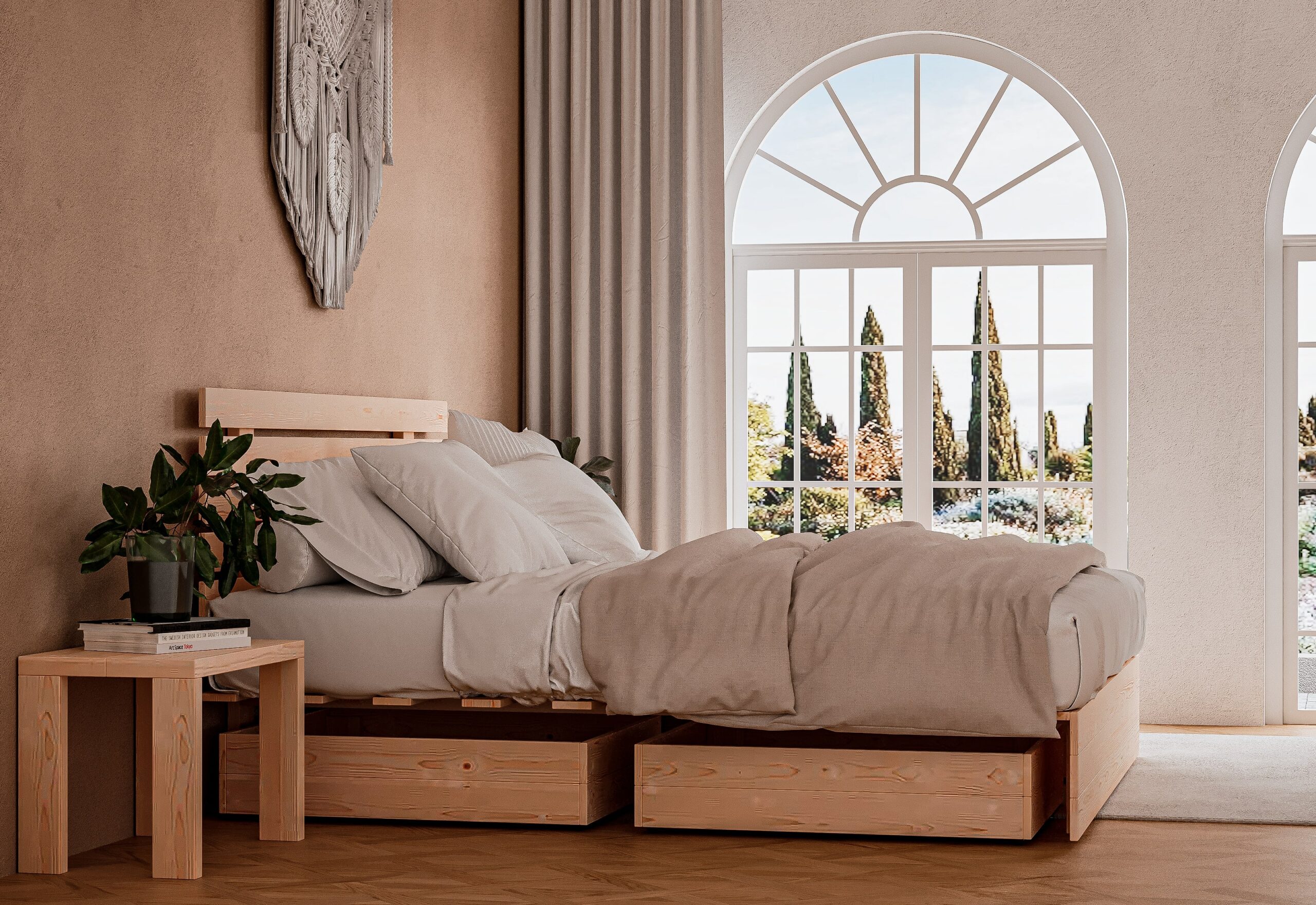 בסיס מיטה זוגית עם מגירות מעץ אורן מלא ואיכותי, משרה בחדר אווירה טבעית ומרגיעה ומכין את הגוף לשינה בריאה ומפנקת, בסיס המיטה חזק ועמיד ביותר.