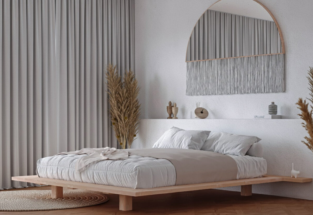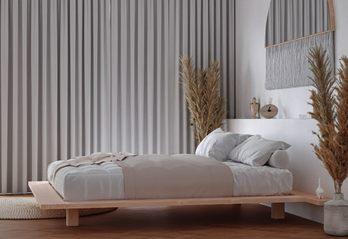 ליצירת מיטה זו קורות העץ נוסרו לפרופיל מרשים ורחב של 4X20 ס”מ, בכדי לייצר תחושה המזכירה מקדשים יפנים מסורתיים.