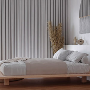ליצירת מיטה זו קורות העץ נוסרו לפרופיל מרשים ורחב של 4X20 ס”מ, בכדי לייצר תחושה המזכירה מקדשים יפנים מסורתיים.